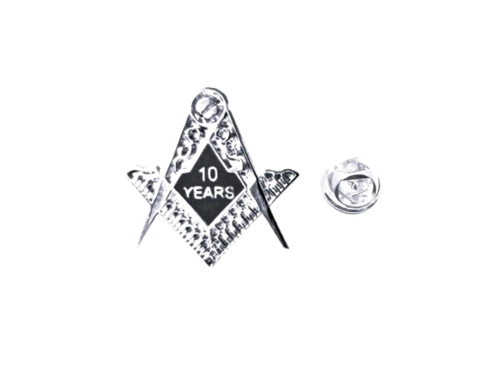 - Classic Masonic square & compass design with 10-year milestone